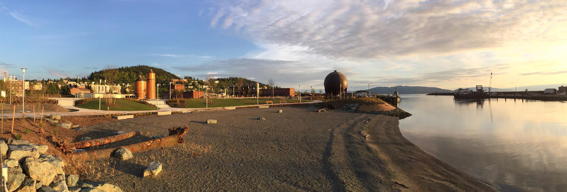 Enjoy sweeping views across the Whatcom Waterway toward Lummi Island and the city skyline, then wander down to the shoreline to experience direct waterfront access and the careful restoration of natural habitat along the bay.