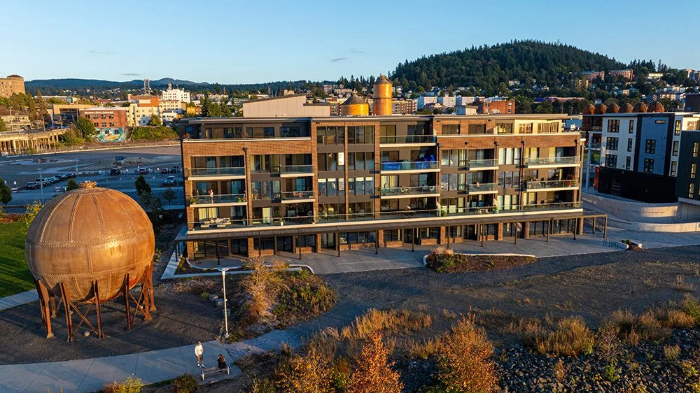 A refined palette of durable, high-quality materials - including stone, brick, tile, concrete, metal, and glass - reflects both the site’s industrial heritage and the natural beauty of the Pacific Northwest.